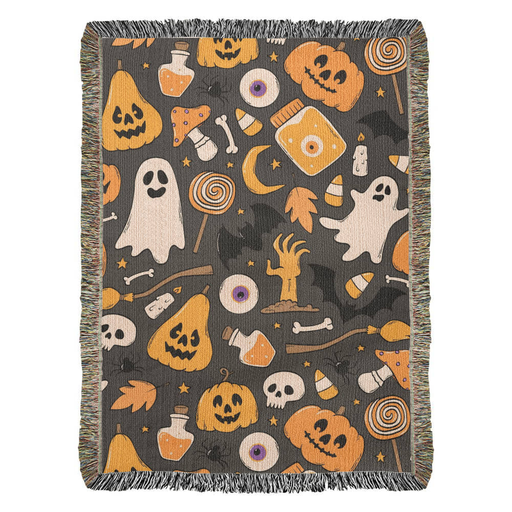 Featuring a playful, all-over pattern of pumpkins, ghosts, candy corn, potion bottles, skulls, fall leaves, and more—this blanket blends Halloween charm with cozy autumn vibes. The rich orange, cream, and charcoal tones pop beautifully on the textured woven fabric, making it as stylish as it is snuggly.